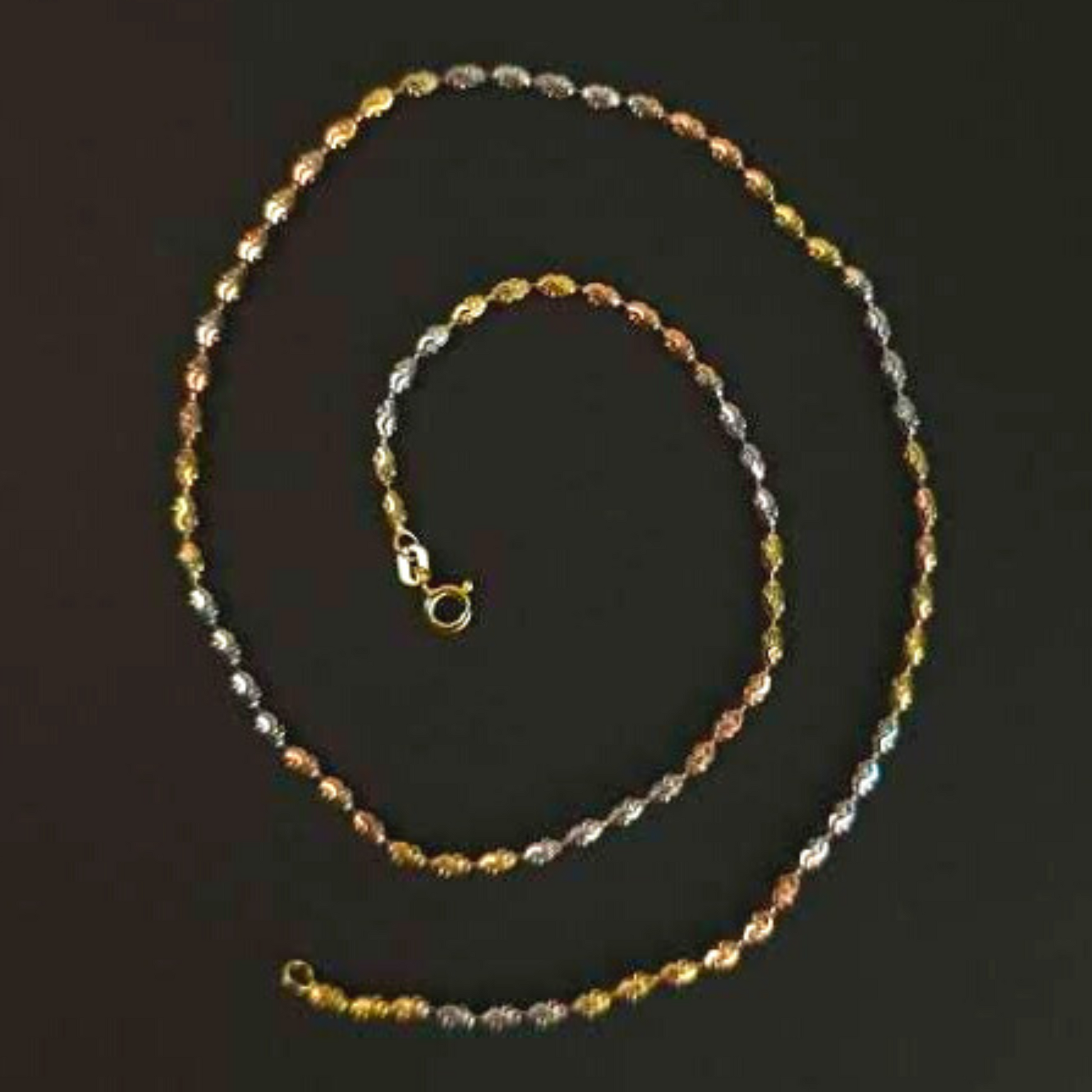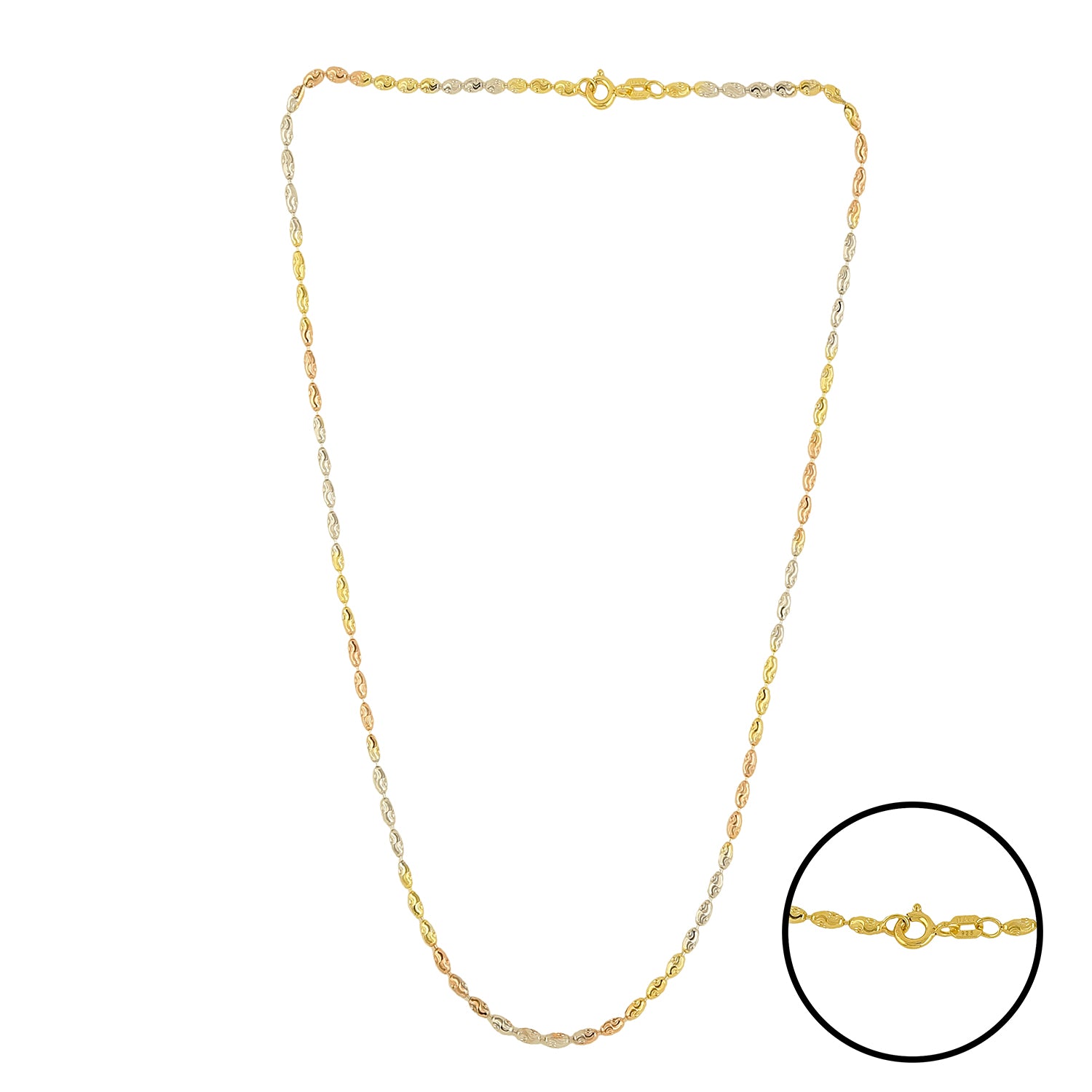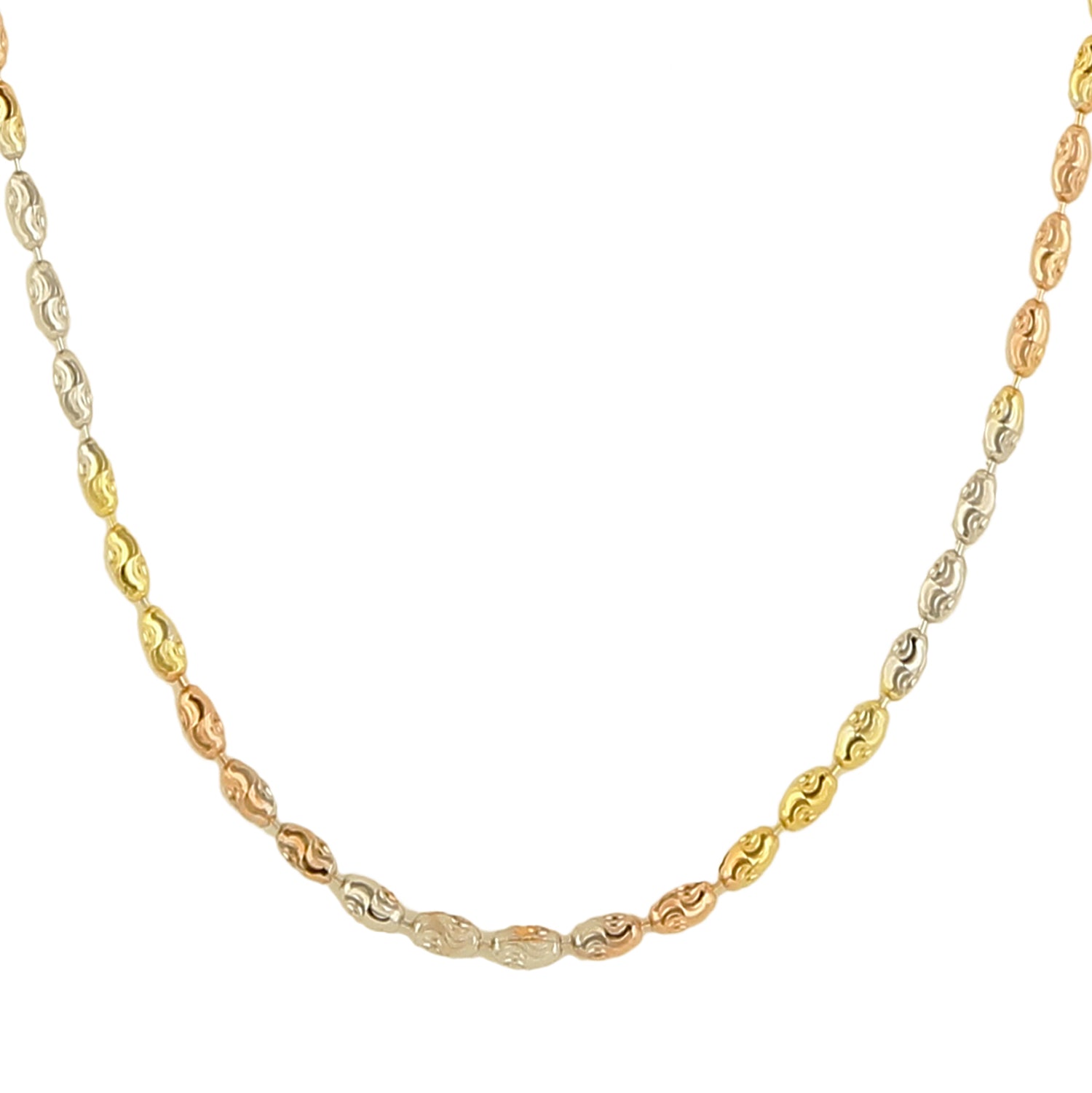 The scallop design chain features alternating silver, gold and rose gold plating to create a stunning contrast. Because of it’s multi-tone shades, this chain is a versatile addition to your accessories. Wear it solo or with a pendant and make a remarkable minimalist statement!