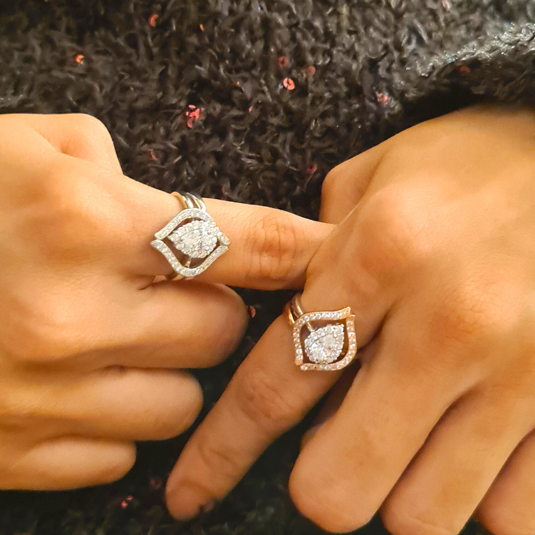A vintage inspired design with a modern twist, this 2 in 1 diametrically opposite ring is designed to take your breath away. Showcasing a beautiful teardrop shaped cubic zirconia that blindingly glistens in centre stage, this ring is a stunner by itself. Partner it with a radiantly flickering eternal flame and further enhance this dazzling beauty. Available in 2 combinations, you wouldn’t have to work hard to blaze a trail with this unique ring of contrasts.